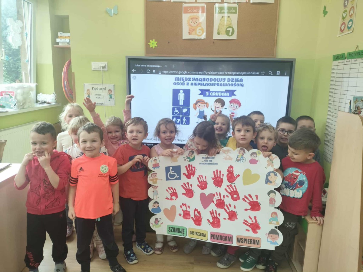 3 grudnia 2025 roku nasze przedszkolaki uczestniczyły w prelekcji na temat osób z niepełnosprawnościami. Celem święta ustanowionego przez ONZ jest przybliżenie społeczeństwu, a więc także przedszkolakom, problemów osób niepełnosprawnych oraz uświadomienie potrzeby pomocy we włączaniu się tych osób w życie społeczne i w pokonywaniu barier architektonicznych. Na zajęciach dzieci poznały podstawowe rodzaje niepełnosprawności i ograniczenia, które niosą ze sobą. Kształtowały współodczuwanie i wykazywały gotowość do nawiązywania kontaktów i poznawania problemów. Dzieci uważnie słuchały, rozmawiały, dzieliły się refleksjami, wyciągały wnioski.